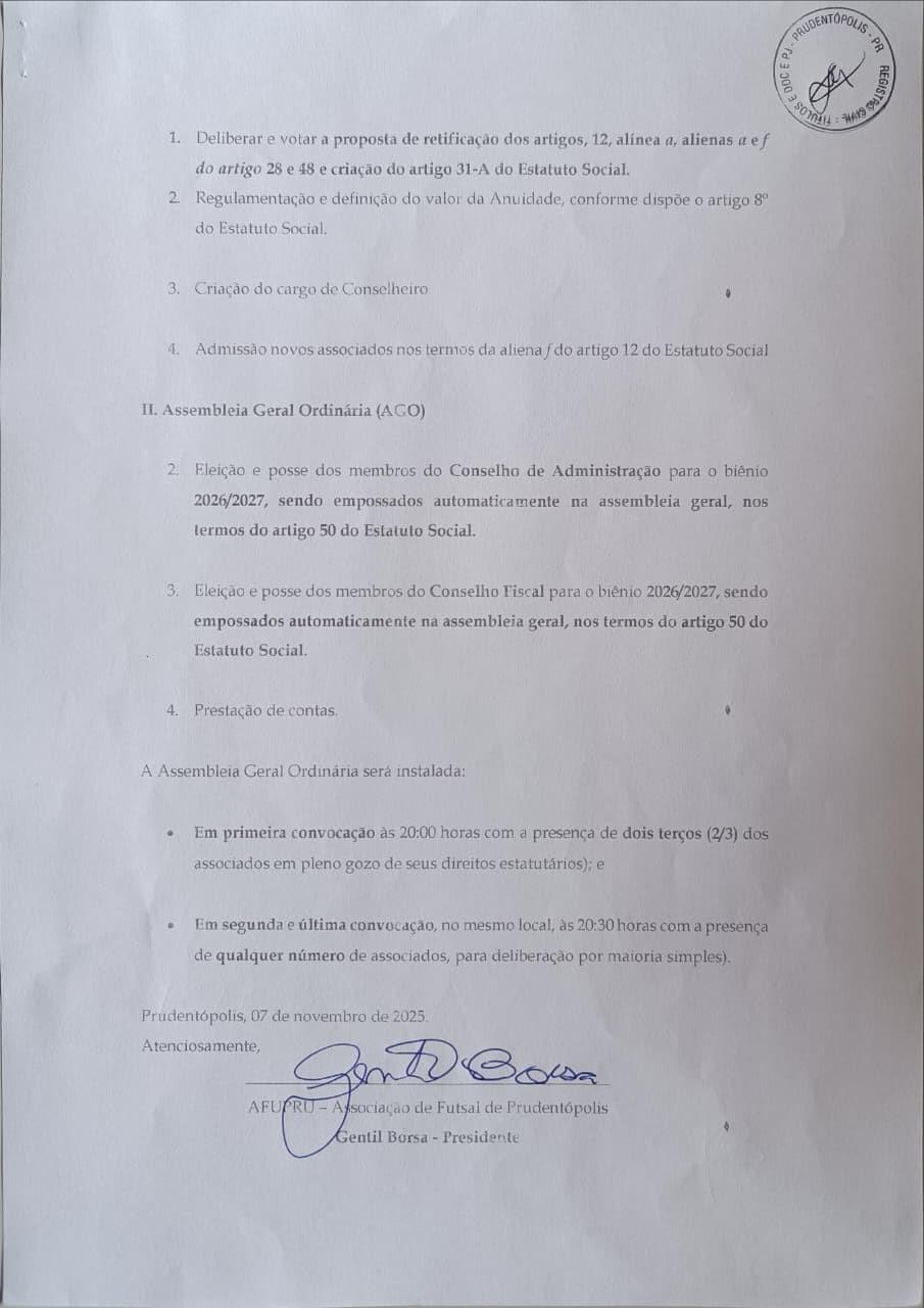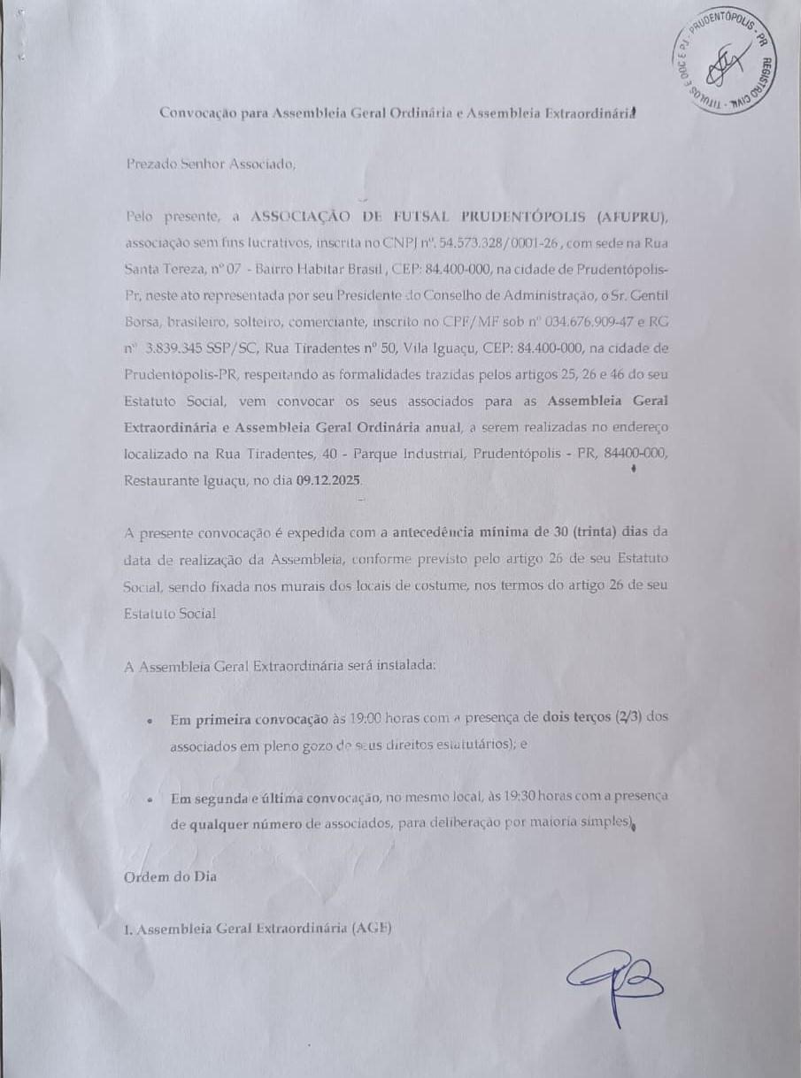 A (Afupru) Associação de Futsal Prudentópolis, convoca os seus associados para as Assembleia Geral Extraordinária e Assembleia Geral Ordinária anual, a serem realizadas no endereço localizado na Rua Tiradentes, 40 - Parque Industrial, Prudentópolis - PR, 84400-000, Restaurante Iguaçu, no dia 09.12.2025.