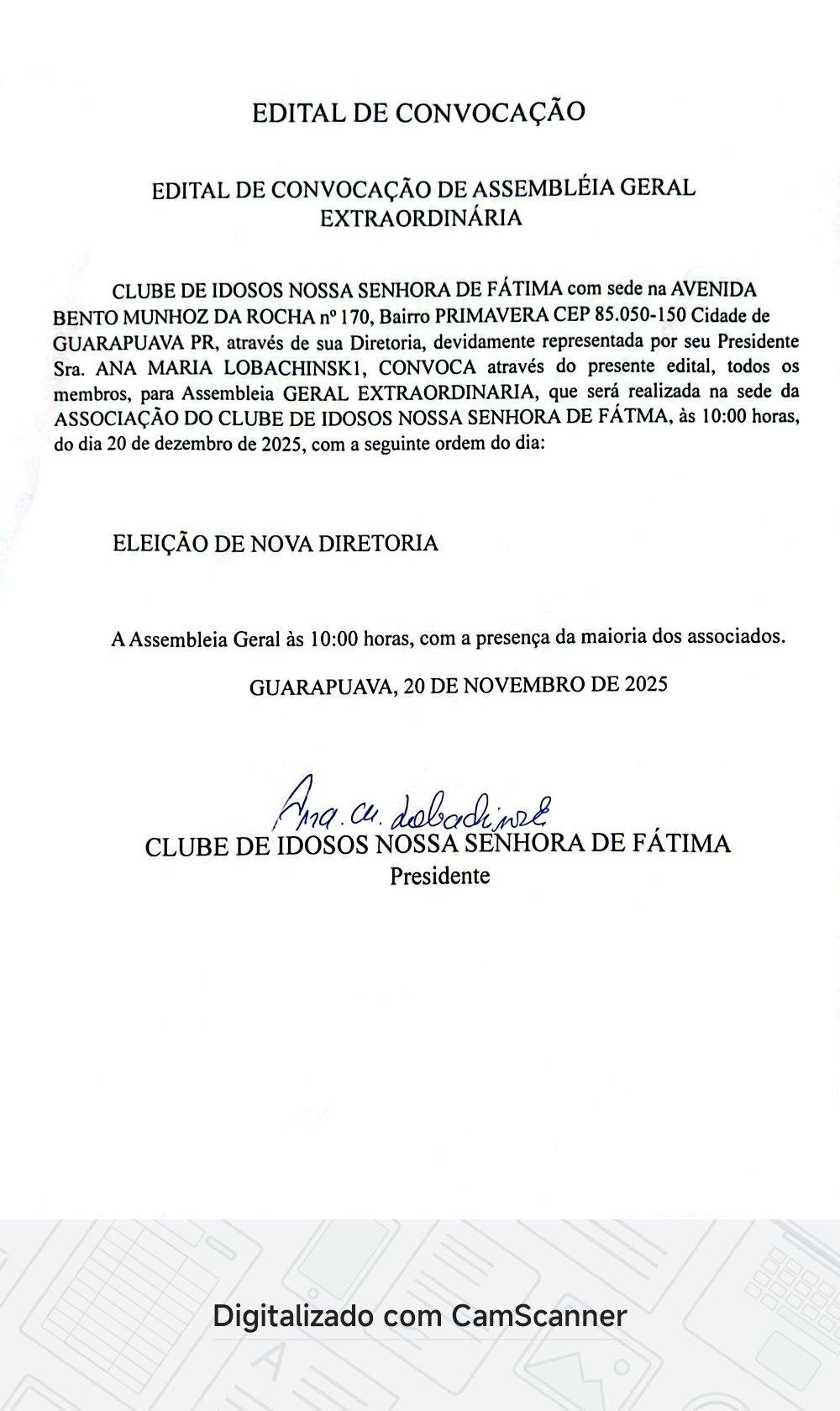 O Clube de Idosos Nossa Senhora de Fátima, com sede na Avenida Bento Munhoz da Rocha Neto, número 170, no bairro Primavera, em Guarapuava, convoca os associados para Assembleia Geral Extraordinária, a ser realizada no dia 20 de dezembro de 2025, às 19h.