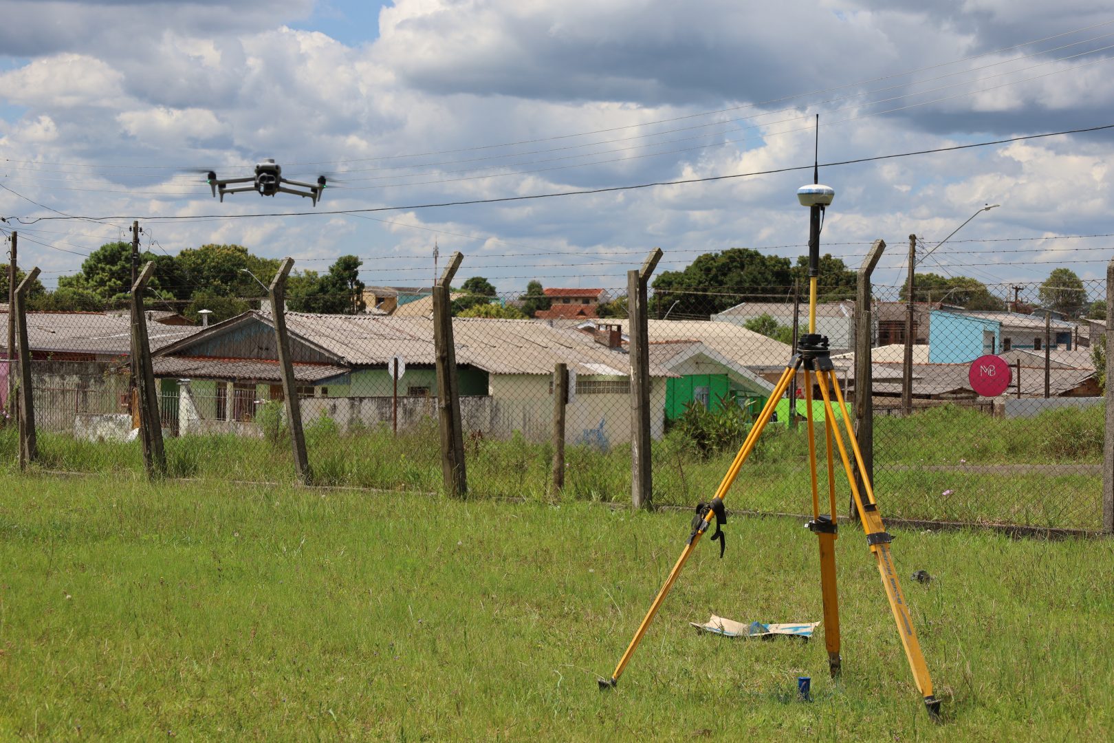 Para a realização do levantamento topográfico no Núcleo São Miguel, está sendo utilizado o sistema de posicionamento por satélite GNSS, com aplicação do método de Posicionamento Cinemático em Tempo Real (RTK). A técnica permite medições com alta precisão e maior agilidade na coleta de dados, reduzindo o tempo de trabalho em campo e aumentando a confiabilidade das informações, o que contribui para que o processo de regularização fundiária avance de forma mais rápida e eficiente.