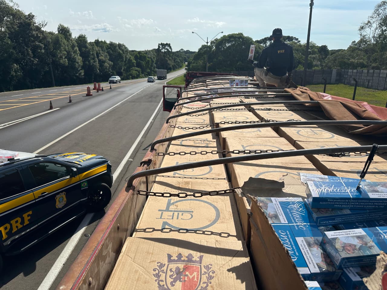 Os policiais deram ordem de parada para o condutor de uma carreta que apresentou informações contraditórias a respeito do que estava transportando. Ao verificar o compartimento de carga, a equipe constatou que estava totalmente carregado com caixas de cigarros da marca “Gift, Classic e Eight”, de origem estrangeira.