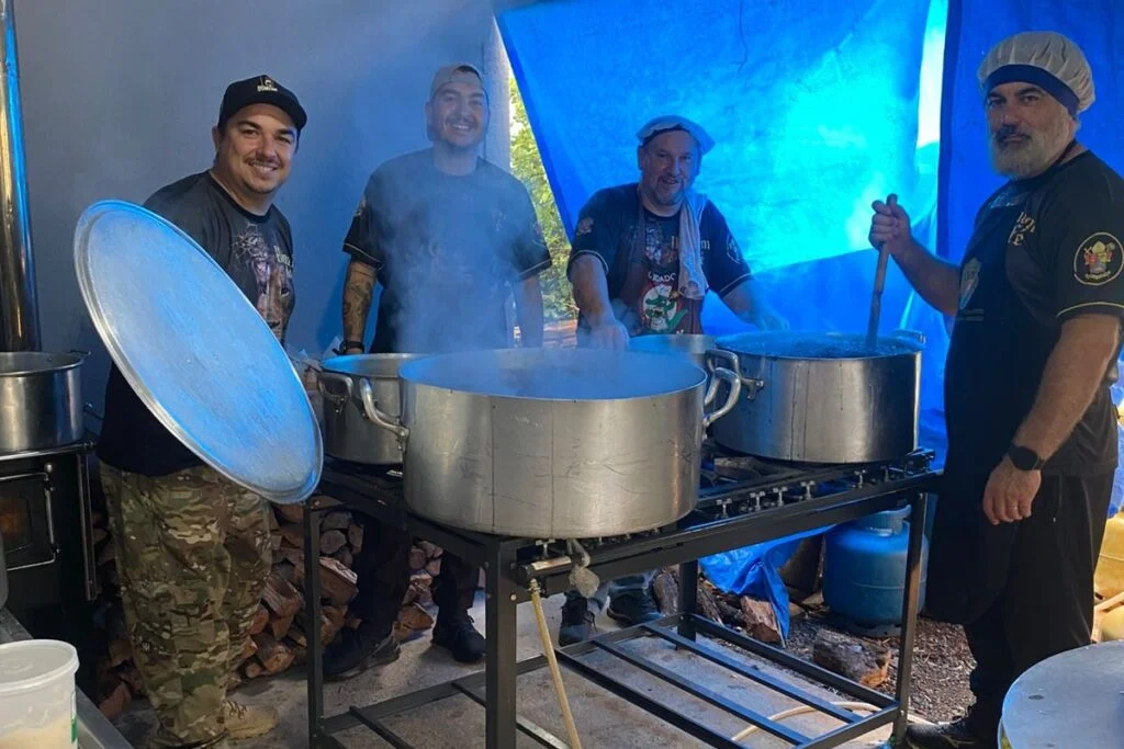 Desde o sábado (8 de novembro de 2025), o movimento “Homens de Fé”, de Guarapuava, organiza diariamente a produção e distribuição de cerca de 700 marmitas destinadas aos voluntários e equipes de trabalho que atuam no atendimento às famílias atingidas.
