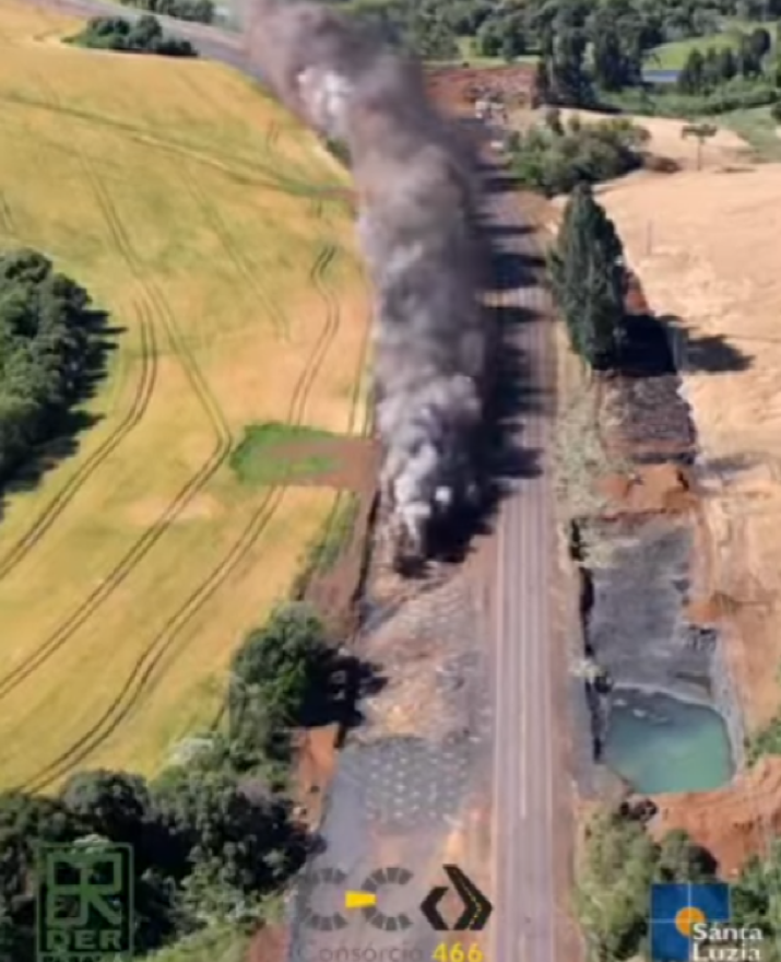 O Departamento de Estradas de Rodagem do Paraná (DER/PR) realizou mais uma detonação de rochas na PRC-466 nesta terça-feira (21 de outubro), na altura do km 243. A medida foi necessária para avançar com a obra de duplicação em concreto da PRC-466 entre Turvo e Palmeirinha (distrito de Guarapuava), estando as rochas no caminho do novo pavimento.